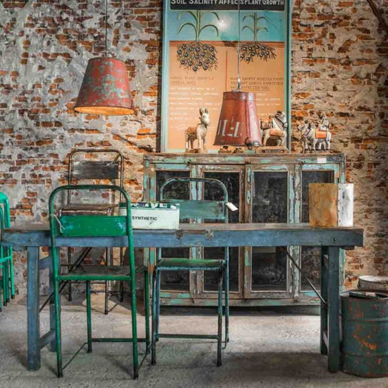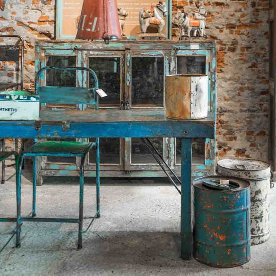 Dieses Original war ursprünglich ein Markttisch und wurde an Festen wie Hochzeiten als Büffettisch eingesetzt. Die Tischplatte ist aus abgeschliffenem Altholz, die Läden auf den Seiten tragen noch ihre ursprüngliche blaue Bemalung. Die Stahlbeine sind einklappbar.