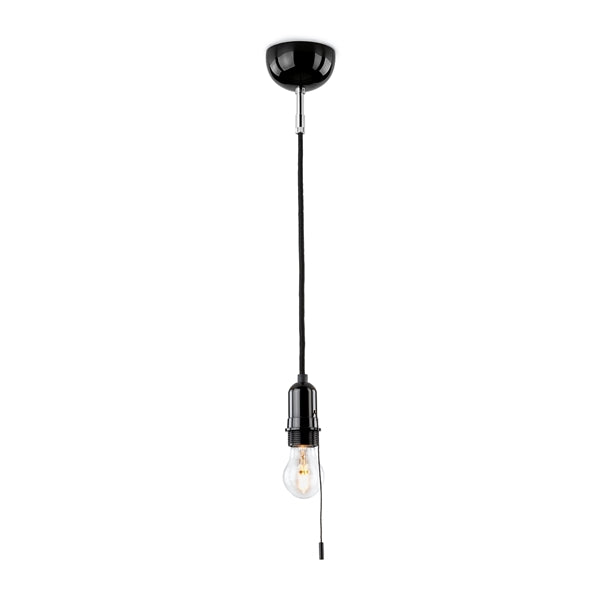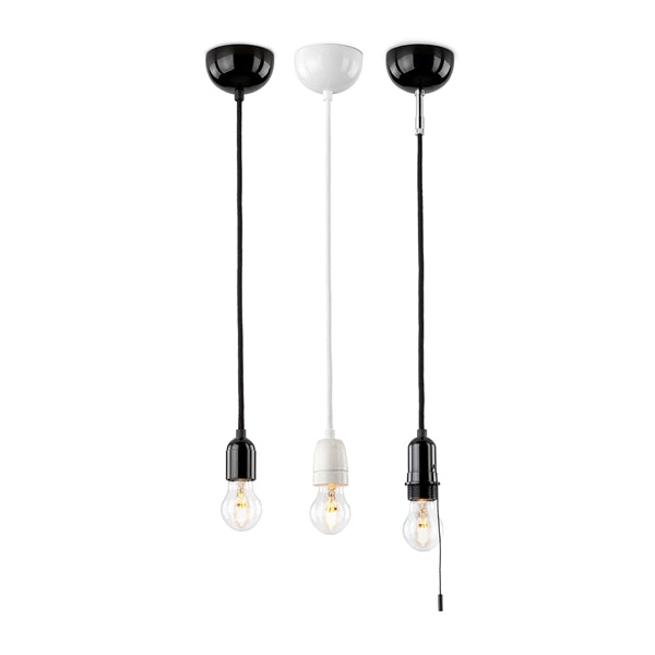 Jede Leuchte ist mit einem 1,5 m langen textilummantelten Kabel und einem glasierten Porzellanbaldachin 9,5 cm Ø in Schwarz oder Weiss ausgestattet. Lieferung ohne Leuchtmittel. IP 20.