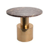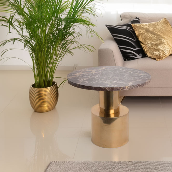 Die Marmor-Tischplatte in Bordeaux verschmilzt perfekt mit dem goldenen Messingfuss.