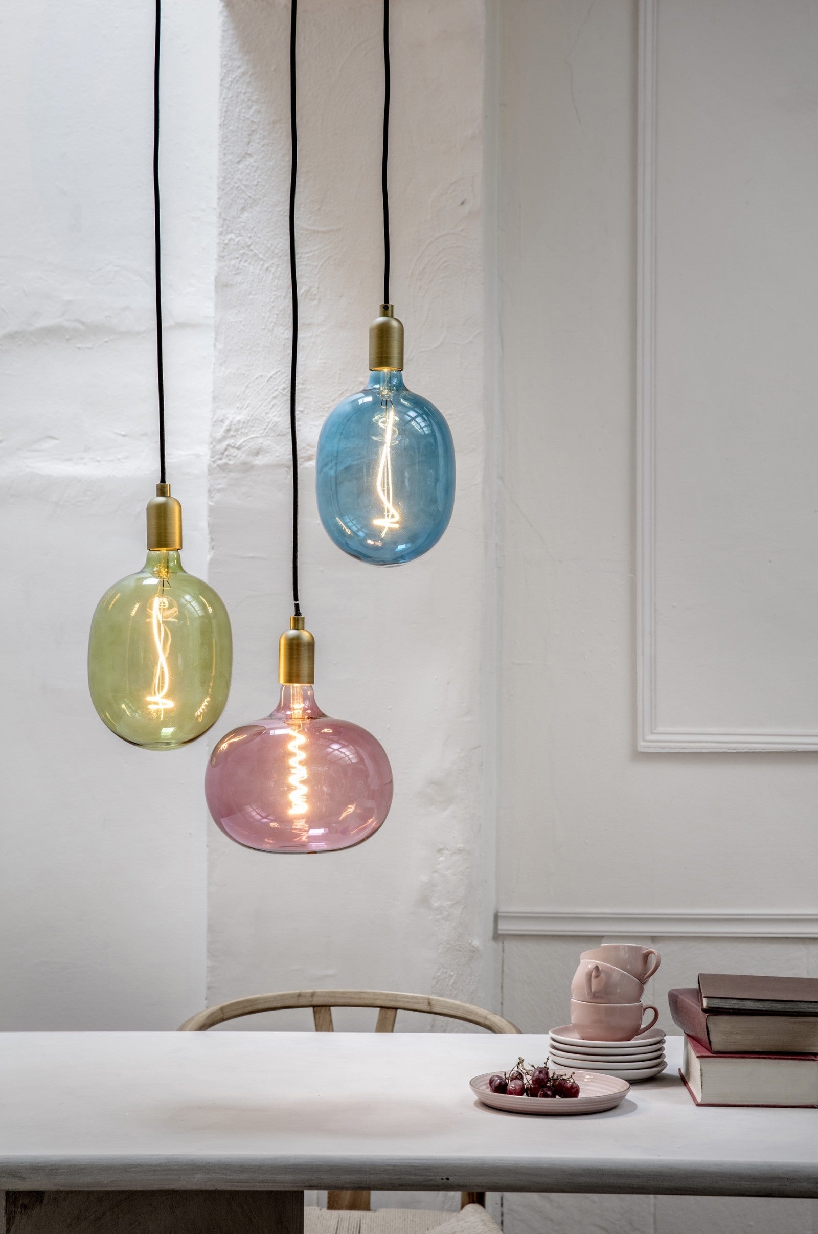 Eine kunstvolle ovale Form mit mehreren Beschichtungen zur Auswahl. Die Farbe des Glases bestimmt nur das Aussehen, nicht das Licht. Jedes Modell dieser Serie hat das Filament, das seine Form am besten ergänzt.