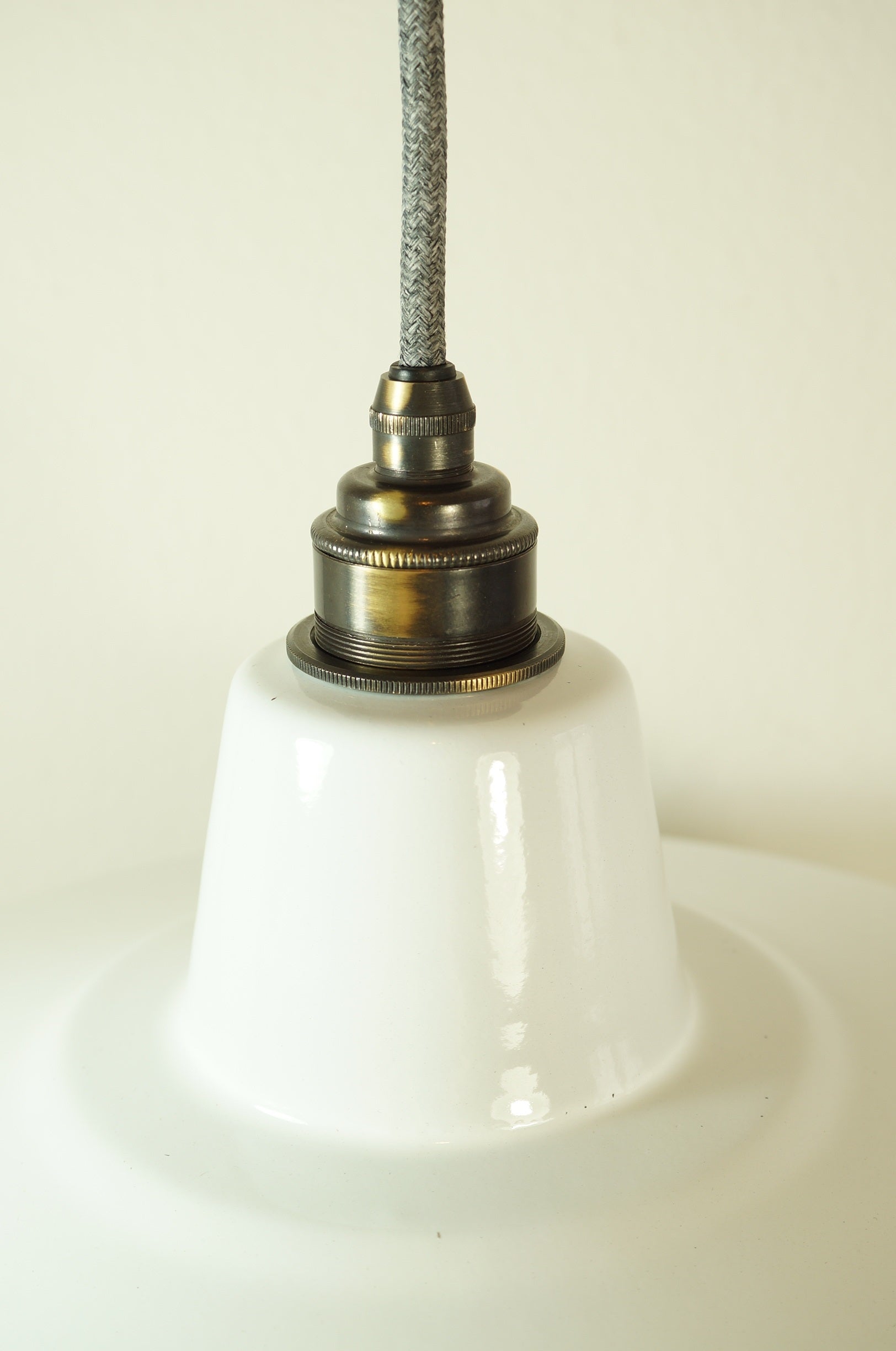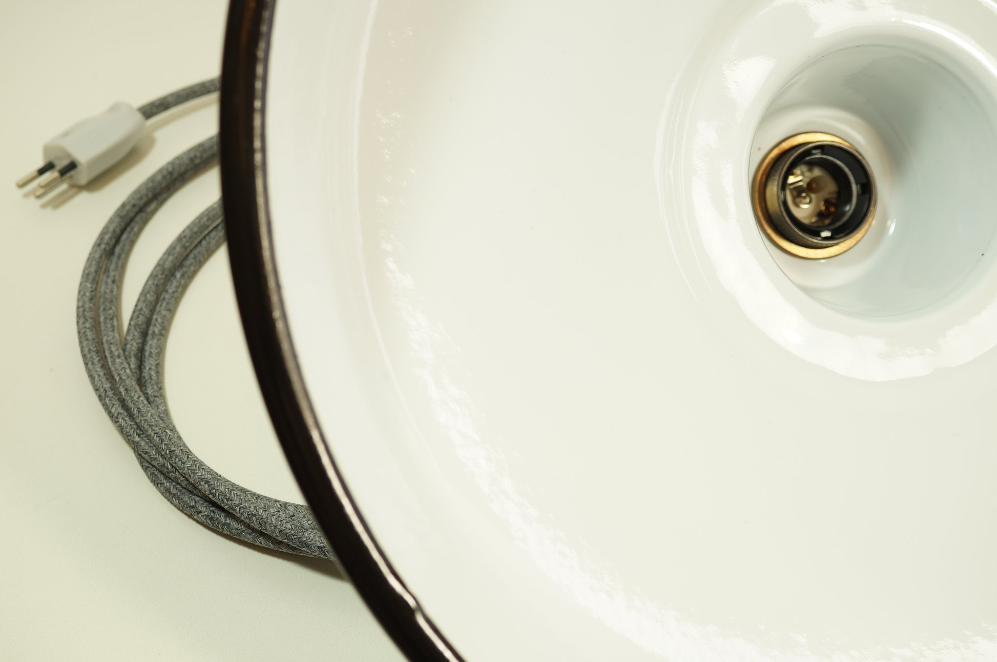 Sehr schöner Emaille Lampenschirm im Stil der 50er Jahre Design. Geeignet für unsere vintage Metallfassungen aus England, sowie den meisten anderen Fassungen (E27) aus unserem Programm. Alles lässt sich einfach kombinieren.
