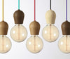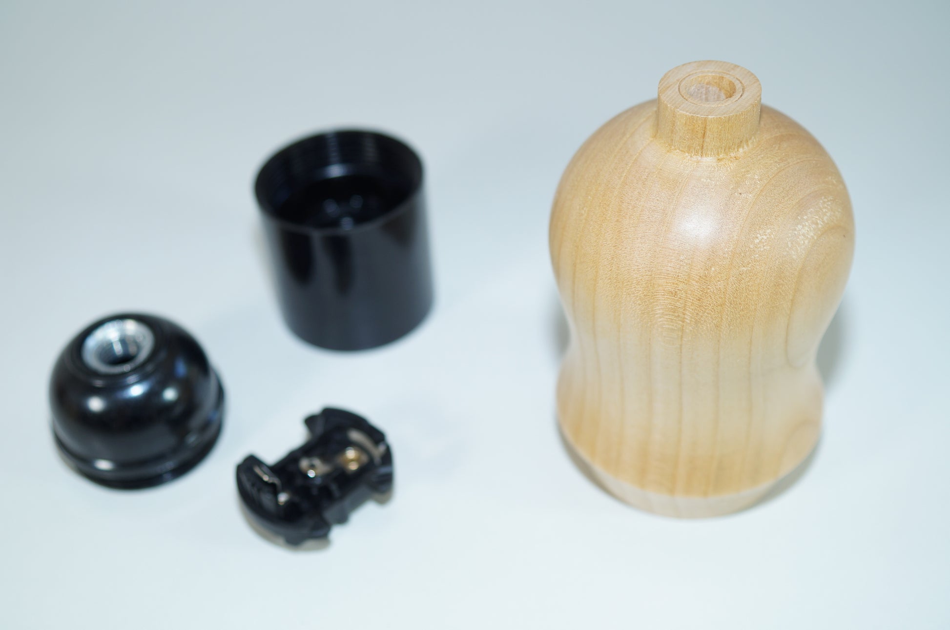 Unsere Holzleuchtenfassungen sind in zwei Formen lieferbar hell mit naturreinem Leinöl oder auf Wasserbasis schonend dunkel gebeizt.