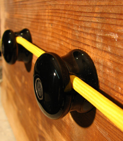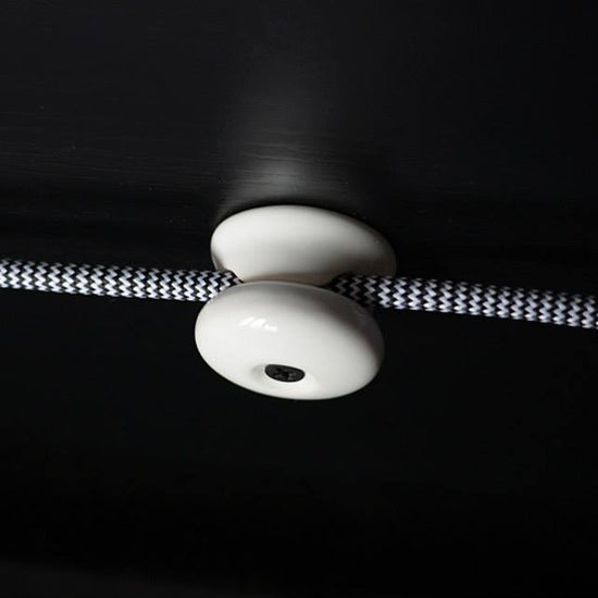 Eine spezielle Kabelführung für Textilkabel, simpel jedoch gleichzeitig unglaublich praktisch und optisch ansprechend. Die Kabelführungen sind aus hochwertigem Porzellan gefertigt und einzigartig in ihrer Art. Diese kleinen, knopfartigen Kabelhalter und Kabelführungen werden sauber mit nur einer Schraube an Decken und Wänden befestigt werden. Es gibt diese in verschiedenen Ausführungen: