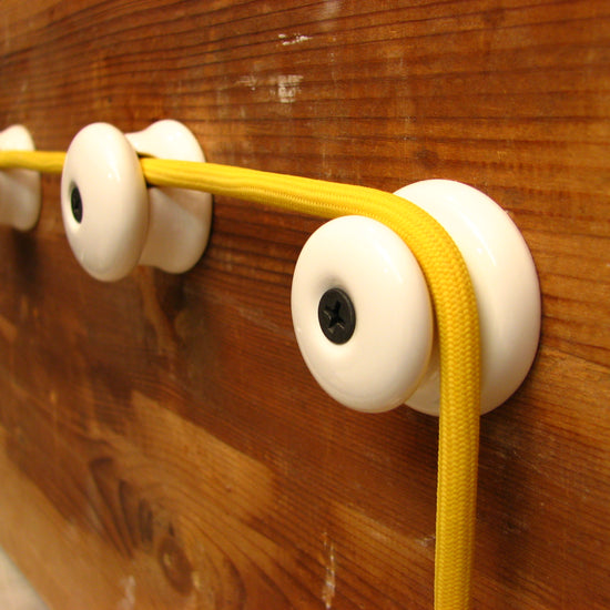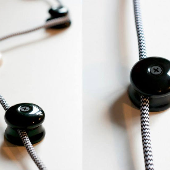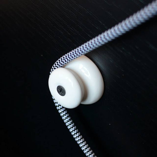 Eine spezielle Kabelführung für Textilkabel, simpel jedoch gleichzeitig unglaublich praktisch und optisch ansprechend. Die Kabelführungen sind aus hochwertigem Porzellan gefertigt und einzigartig in ihrer Art. Diese kleinen, knopfartigen Kabelhalter und Kabelführungen werden sauber mit nur einer Schraube an Decken und Wänden befestigt werden. Es gibt diese in verschiedenen Ausführungen: