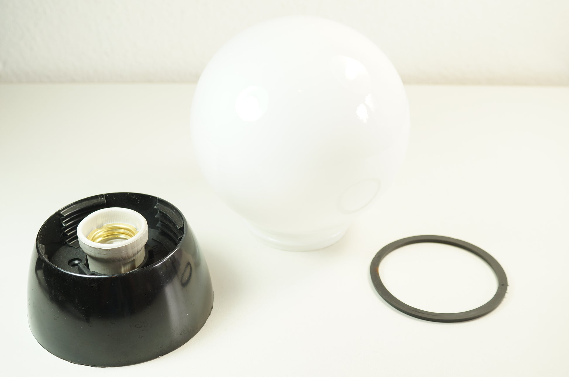 Klassische Decken- oder Wandlampe mit Bakelitfuss und weissem Milchglas.