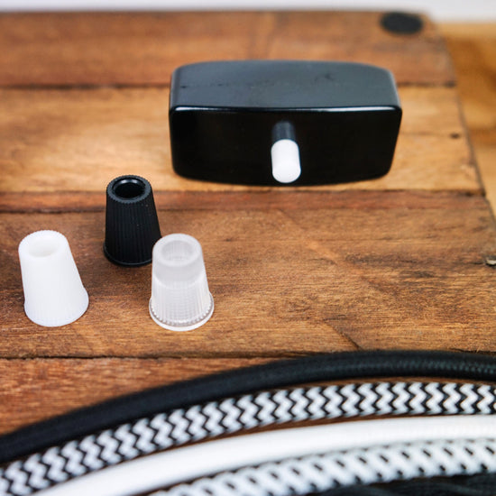 Klassische Porzellanlampenfassung E27 aus Italien. Design mit glatter Aussenwand. Gewinde inkl. schwarzer Zugentlasstung.