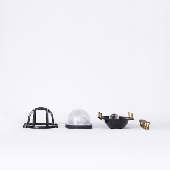 Diese Leuchte besteht aus einem schweren Stahlrahmen, der eine robuste Glasschale sicher umschließt. Eine Standard-E27-Tubular-Schraubbirne (s. Zubehör) passt mühelos hinein und sorgt für ein angenehmes, warmes Licht. Sie muss mit einem standardmässigen 3-adrigen Beleuchtungskabel verkabelt werden und lässt sich unkompliziert an jeder flachen Wandoberfläche montieren.