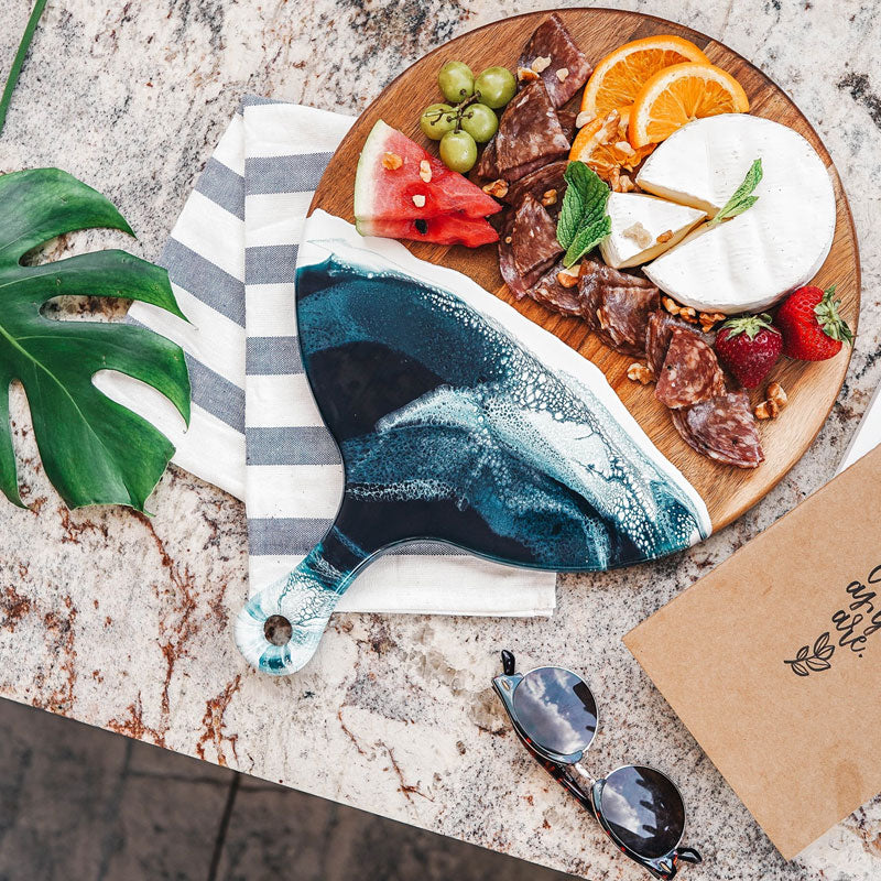 Hochwertiges und äusserst dekoratives Serviertablett aus Akazienholz und einzigartiger Harzverzierung, in kleinen Mengen handgefertig in Kanada. Jedes Exemplar ein Einzelstück!
