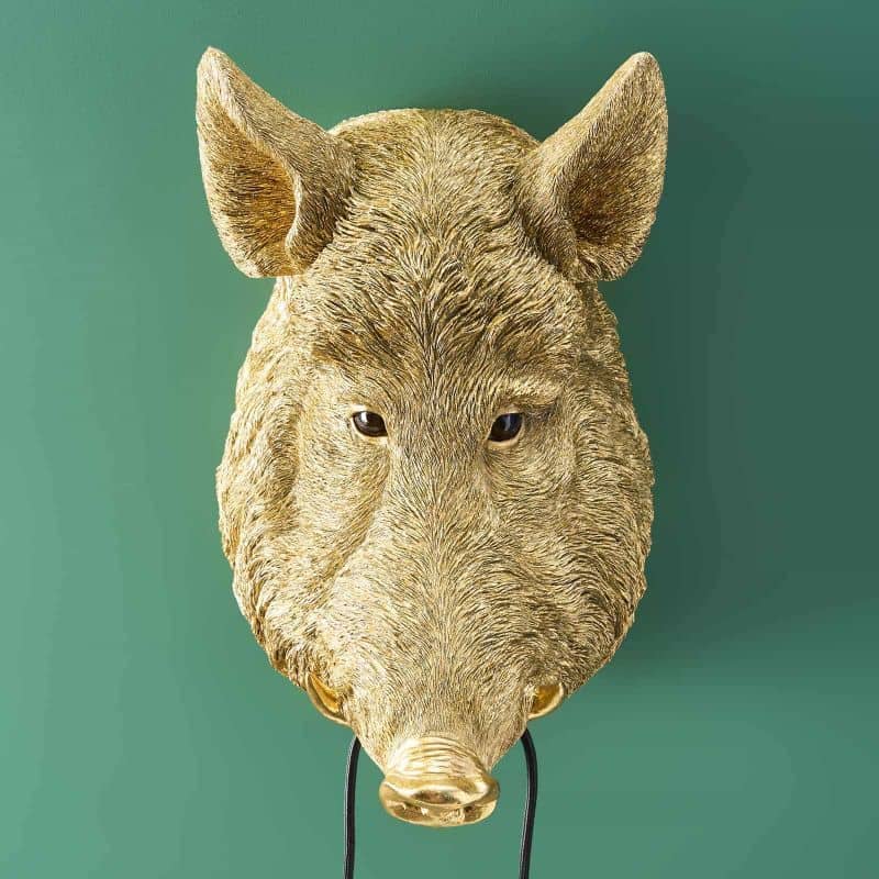 Die Wandleuchte Wildschwein Willy in Gold ist ein ausdrucksstarkes Designobjekt, das jedem Raum einen markanten, humorvoll-edlen Akzent verleiht. Der detailreich modellierte Wildschweinkopf mit seinem warm schimmernden Goldfinish wirkt wie eine moderne Skulptur und setzt an der Wand ein eindrucksvolles Statement – ob im Wohnzimmer, Eingangsbereich, Flur oder in stilvollen Gastro-Interieurs.
